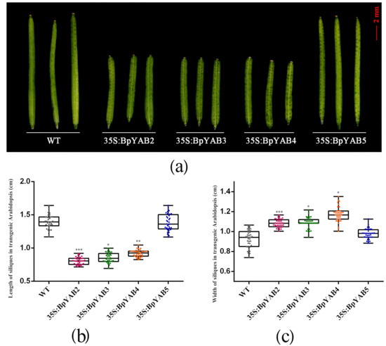 The ectopic expression of BpYAB2, BpYAB3, and BpYAB4 will cause the Arabidopsis silique length to be significantly shorter (Figure 8). The length and width of the wild-type and transgenic Arabidopsis siliques were measured, and the results of statistical analysis of differences found that the lengths in the transgenic of BpYAB2 (p < 0.001), BpYAB3 (p < 0.05) and BpYAB4 (p < 0.01) line were significantly shorter than those of the wild-type and 35S:BpYAB5 lines (Figure 8a,b), and the widths were slightly greater than those of the wild-type and 35S:BpYAB5 lines (Figure 8c). Therefore, the ectopic expression of BpYAB2, BpYAB3, and BpYAB4 can cause the length of the Arabidopsis silique to be significantly shorter.