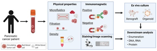 Isolation of circulating tumor cells (CTCs) in pancreatic cancer. Various enrichment and detection methods have been used to identify CTCs. Identified CTCs may be propagated by ex vivo culture through xenografts or organoids, or directly analyzed for enumeration and DNA/RNA/protein profiling.