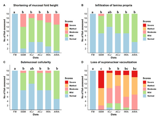 - Baeverfjord, G.; Krogdahl, Å. Development and regression of soybean meal induced enteritis in Atlantic salmon, Salmo salar L., distal intestine: A comparison with the intestines of fasted fish. J. Fish Dis. 1996, 19, 375–387. [Google Scholar] [CrossRef]