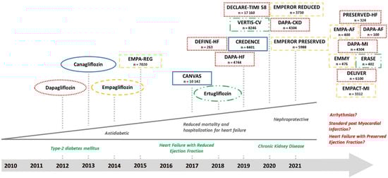 - Bhatt, D.L.; Szarek, M.; Steg, P.G.; Cannon, C.P.; Leiter, L.A.; McGuire, D.K.; Lewis, J.B.; Riddle, M.C.; Voors, A.A.; Metra, M.; et al. Sotagliflozin in Patients with Diabetes and Recent Worsening Heart Failure. N. Engl. J. Med. 2021, 384, 117–128. [Google Scholar] [CrossRef]