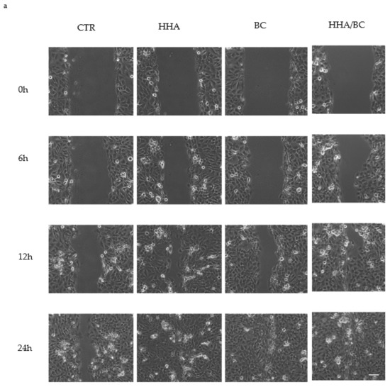 In particular, micrographs of wound closure (Figure 3a) indicate that HHA/BC prompted faster wound reparation than the sole HHA or BC. The average time needed to reach 40 and 80% wound repair in the presence of the different treatments is reported, showing that the presence of HHA/BC increased the reparation rate by about 2-fold as compared to the control (CTR). A lower improvement of the closure rate was found by treating the cells with HHA and BC alone, highlighting the synergic effect obtained by coupling the two products (HHA/BC).