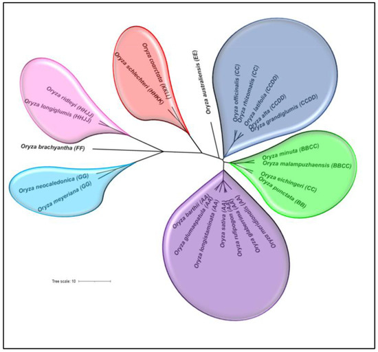 In the field of crop breeding, it has been realized that improvement of most of the major crops, including rice, has reached their plateau due to the narrow genetic base of the cultivated species. Hence, the researchers are gradually turning their attention towards the exploration and utilization of Crop Wild Relatives (CWRs), which encompasses a wide reservoir of genetic diversity valuable for the improvement of the crop, particularly for tolerance to different abiotic as well as biotic stresses with enhanced yield potential [19,20,21]. The genus ‘Oryza’ comprises about 27 species having distinct ecological adaptations. These include two independently domesticated cultivated rice species, viz., O. sativa (Asian rice) and O. glaberrima (African rice), whereas the remaining species are wild. These 27 Oryza species are estimated to have evolved over 15 million years ago and have diverged into 11 genome types comprising six diploid (AA, BB, CC, EE, FF, and GG) and five polyploid (BBCC, CCDD, HHJJ, HHKK, and KKLL) genomes [1,19]. The phylogenetic relationship among the Oryza species with different genome types is depicted in Figure 1. Both the cultivated rice species are diploid (AA genome), which have evolved through a series of events, such as introgression, natural selection, and breeding [22]. Therefore, considering the importance of CDCPs, particularly in conferring abiotic stress tolerance in plants, the present study was aimed to identify the CDCP families in the available genomes of ten Oryza species, comprising both wild and cultivated rice, to understand their evolution, conservation/diversification as well as their association with abiotic stress tolerance.