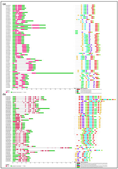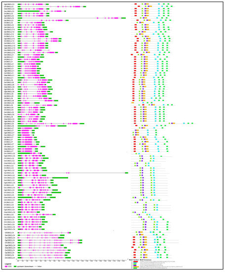 Following the phylogenetic analysis of the CDCPs in different Oryza species, we analyzed their gene structure as well the conservation of different protein motifs, to gain insight into their molecular diversity (Figure 4, Figure 5, Figure 6, Figure 7 and Figure 8). Generally, it has been found that a loss or gain of intron leads to structural complexity which functions as an important evolutionary force in the case of large protein families [38]. In the case of plants, genes with higher expression levels tend to have longer introns and untranslated regions in comparison to the low expressing ones [39]. In our analysis, we observed the orthologs of each CDCP from different Oryza species to exhibit high conservation in both gene structure and protein motifs. Corresponding to the phylogenetic study, the variations in gene structure and protein motif conservation were majorly observed in the CDCP members from O. longistaminata, followed by the ones from O. brachyantha, suggesting these two species as the distant ancestors, as reported previously [30,33].