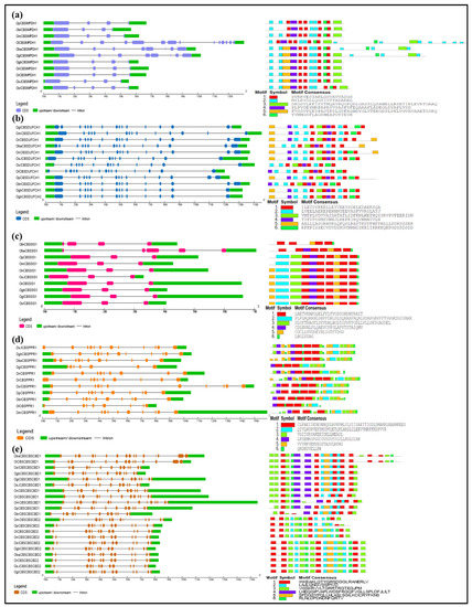 Schematic representation of the conservation of gene structure and protein motifs in (a) CBSIMPDH, (b) CBSDUFCH, (c) CBSSIS (d) CBSPPR, and (e) CBSCBSCBD members of CDCP family from different Oryza species. The respective length of UTR, exon, and intron for each ortholog are well in proportion to actual sequence lengths. The order of the different CDCPs is kept by their phylogenetic relationship. The conserved motifs are predicted through the MEME suite.
