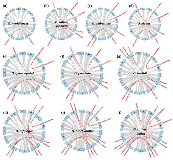 Gene duplication analysis of CDCP genes in different Oryza species. The duplication analysis was carried out in 10 genomes of 9 Oryza species, namely (a) O. meridionalis (b) O. sativa subsp. japonica (c) O. glaberrima (d) O. nivara (e) O. glumaepatula (f) O. punctata (g) O. barthii (h) O. rufipogon (i) O. brachyantha, and (j) O. sativa subsp. indica. The chromosome number is shown in the middle of each chromosome and the genomic location for each gene has been marked on the respective chromosomes. The grey lines in the background represent the collinear blocks within each genome. The red-colored lines highlight the duplication events present. The gene duplication analysis was carried out using the MCScanX toolkit.