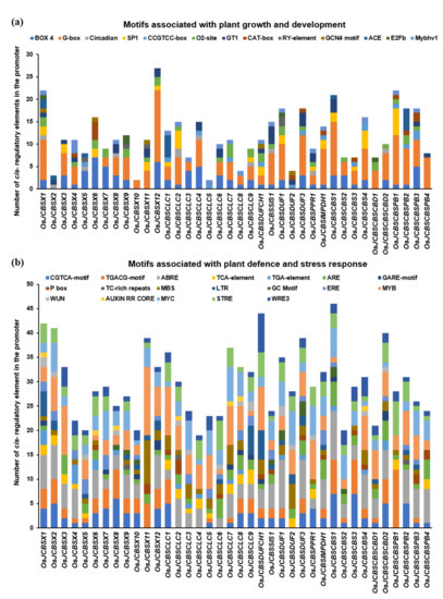 Analysis of the cis-regulatory elements present in the 2 kb upstream promoter region of different CDCP genes from O. sativa subsp. japonica. (a) Motifs related to plant growth and development and (b) motifs related to plant defense and stress response. Each colored box and its length in the bar represent a specific motif and its frequency of occurrence in the promoter, respectively.