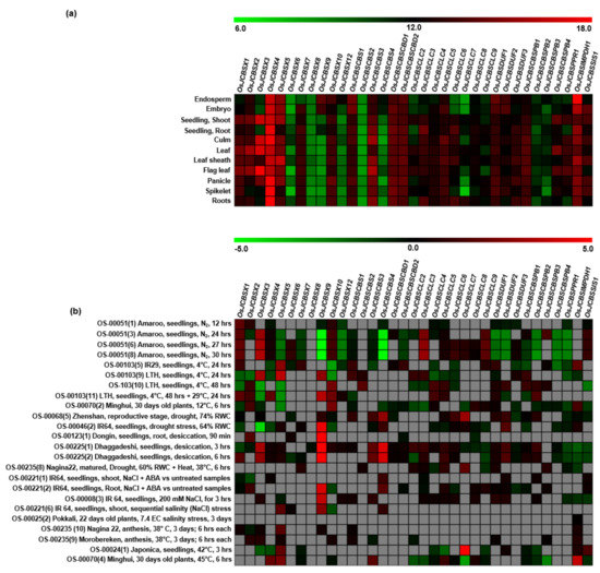 To understand the anatomical, developmental, and stress-responsive expression of different CDCP genes in the cultivated O. sativa subsp. japonica, the gene expression profiles were retrieved from the GENEVESTIGATOR database. For a comprehensive analysis, datasets from both Affymetrix and RNA-seq experiments were taken into consideration. However, it should be noted that the expression data for OsJCBSX11, OsJCBSCLC1, OsJCBSCLC10, and OsJCBSDUFCH1 were unavailable in the database; hence, they could not be analyzed in the present study. We found marked variations between transcripts of different genes encoding CDCPs in various tissues (Figure 11a). The OsJCBSX4, OsJCBSCBS1, OsJCBSCBSCBD1, OsJCBSDUF1, and OsJCBSIMPDH1 exhibited consistently higher expression levels in all the tissues, suggesting their prominent role in diverse growth and development processes. Though not many studies have been conducted on these CDCPs, Zafar et al. [12] recently reported the role of OsCBSDUF1 (they termed it as Degenerated Panicle and Partial Sterility (DPS1)) in seed setting via regulation of ROS homeostasis. This finding strengthens our observation that these CDCPs have a crucial role in plant growth and developmental processes. In another instance, we found OsCBSX9 to have higher expression levels in the endosperm, embryo, and seedling root, indicating its role in seed storage or germination. Likewise, OsCBSCBS4 also showed elevated expression only in the endosperm and embryo.