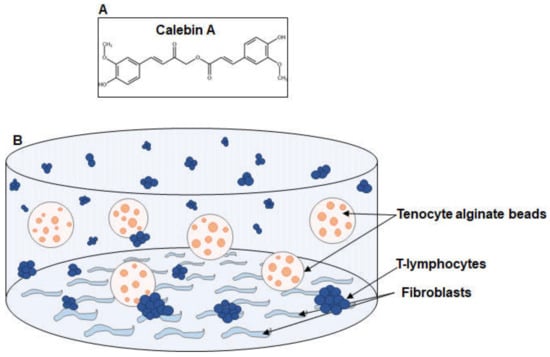 (A) Chemical structure of the natural compound Calebin A. (B) Graphic illustration of the experimental set-up for creation of pro-inflammatory multicellular microenvironment tendinitis (TN-ME) conditions in alginate cultures.