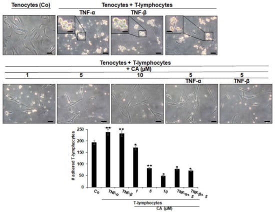 Effect of Calebin A (CA), TNF-α or TNF-β on T-lymphocytes adhesiveness on tenocytes in an inflammatory environment. Serum-starved tenocyte monolayer cultures alone (control, Co), or co-cultured with T-lymphocytes, or co-cultured with T-lymphocytes and TNF-α or TNF-β (10 ng/mL), were either left untreated or treated with various concentrations of CA (1, 5, 10 µM) for 18 h and, subsequently, photographed using a light microscope (Zeiss, Jena, Germany). All assays were performed three times. Data with p < 0.05 (*) and p < 0.01 (**) indicate a significant difference compared to control. Magnification: ×100; scale bar = 30 nm. Insets: magnification: ×400; scale bar = 3 nm.