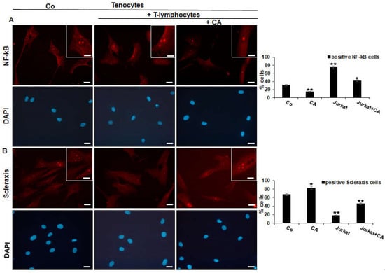 Effect of Calebin A (CA) on NF-κB (A) and on Scleraxis (B) in tenocytes cultured in an inflammatory environment analyzed by immunofluorescence. Serum-starved tenocyte monolayer cultures alone (control, Co) or co-cultured with T-lymphocytes were either left untreated or treated with CA (5 µM) for 5 h. Magnification ×400; scale bar = 45 nm. All experiments were conducted three times and quantification of positively NF-κB- or Scleraxis-labeled nuclei was performed by counting 400–500 cells from 10 different microscopic fields. Values of p < 0.05 (*), p < 0.01 (**) were considered statistically significant in relation to control.