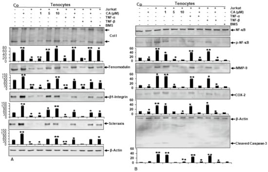 Effect of Calebin A (CA) and IKK-inhibitor BMS-345541 on extracellular matrix and inflammation-associated proteins in tenocyte monolayer cultures. Serum-starved tenocytes in monolayer cultures alone (Co) or co-cultured with T-lymphocytes, or co-cultured with T-lymphocytes and TNF-α or TNF-β (10 ng/mL), were either left untreated or treated with various concentrations of CA (1, 5, 10 µM) or BMS-345541 (5 µM) for 18 h. Western blot analysis was conducted using whole-cell extracts separated by SDS-page, analyzed for (A) Collagen I, Tenomodulin, β1-Integrin, Scleraxis and (B) NF-κB, p-NF-κB, MMP-9, COX-2 and Cleaved Caspase-3, whereby β-Actin served as an internal loading control. Bars demonstrate the mean values of antibodies with the standard deviations of three independent experiments. Values p < 0.05 (*) and p < 0.01 (**) are considered statistically significant in reference to control.