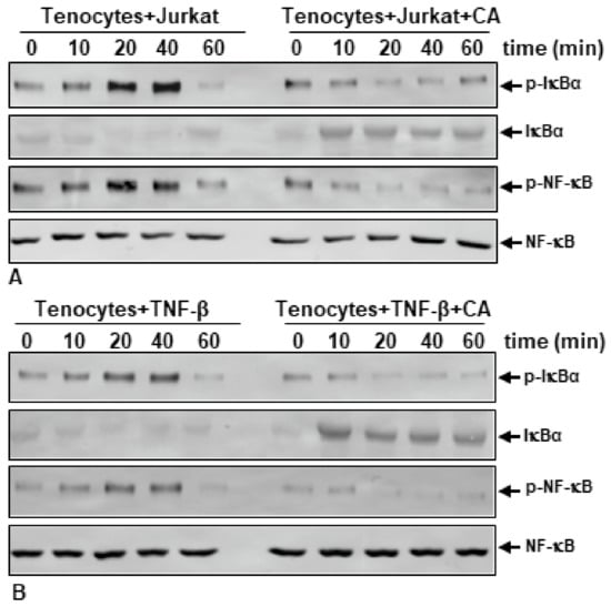 As mentioned before, the transcription factor NF-κB plays a fundamental role in inflammatory processes by further activating pro-inflammatory, matrix-degrading and apoptosis-promoting genes in tenocytes. As a key regulator of NF-κB signaling pathway activation, the IκB-kinase (IKK) complex phosphorylates NF-κB inhibitor IκBα. The phosphorylation process of IκBα is caused by the transcription factor NF-κB, which subsequently is able to translocate in its active form (p-NF-κB) into the nucleus, where it activates various gene expressions [,]. To further elucidate the effect of CA on IκBα-mediated NF-κB activation in tenocytes, residing in an inflammatory environment, we performed a Western blot analysis of monolayer cultures, which were either treated with TNF-β or with TNF-β and CA, or were co-cultured with T-lymphocytes and left untreated or treated with CA. Cultures were exposed to their treatments for indicated times and IκBα and NF-κB expression was analyzed (Figure 5). T-lymphocyte- (Figure 5A) and TNF-β (Figure 5B)-induced inflammatory environment cultures similarly showed an increasing expression of the phosphorylated form of IκBα (p-IκBα) and activated p-NF-κB with a maximum level at 40 min, while the expression of NF-κB inhibitor IκBα synchronously decreased with a minimum at 40 min, visualizing the IκBα-mediated NF-κB activation cascade. In inflammation-induced cultures, the expression of p-IκBα and p-NF-κB is significantly suppressed by CA treatment in a time-dependent manner, indicating that CA inhibits the degradation of IκBα and simultaneously blocks pro-inflammatory p-NF-κB activation.