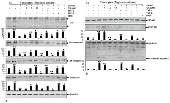 Effect of Calebin A (CA) and specific IKK-inhibitor BMS-345541 on (A) extracellular matrix by using antibodies against Collagen I, Tenomodulin, β1-Integrin, Scleraxis and on (B) inflammation and apoptosis by using antibodies against NF-κB, p-NF-κB and Cleaved-Caspase-3. Serum starved tenocytes in alginate bead cultures alone (Co) or cultured in TN-ME or co-cultured with T-lymphocytes and TNF-α or TNF-β were either left untreated or treated with various concentrations of CA (1, 5, 10 µM) or BMS-345541 (5 µM) for 8 days. As an internal loading control anti-β-Actin antibody was used. Additionally, densiometric analysis of protein expression found by Western blotting was conducted in triplicate, whereby values p < 0.05 (*) and p < 0.01 (**) mark statistically significant data compared to control.