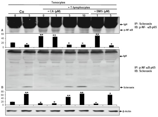 Effects of Calebin A (CA) and BMS-345541 on the association of p-NF-κB to Scleraxis in tenocytes cultured in TN-ME by co-immunoprecipitation assay analysis. Tenocytes in alginate beads cultured solely (Co), were left untreated or treated with CA (5 µM) or co-cultured with fibroblasts and T-lymphocytes (TN-ME) and either kept untreated or treated with different concentrations of CA (1, 5, 10 µM) or BMS-345541 (1, 5 µM) for 8 days. Proteins of samples were either immunoprecipitated (IP) with Scleraxis and immunoblotted (IB) with anti-p-NF-κB (A) or immunoprecipitated with anti-p-NF-κB (IP) and subjected to immunoblotting (IB) by using Scleraxis antibody (B). As a housekeeping gene, β-Actin was used as a control. Data revealing p < 0.05 (*) or p < 0.01 (**) are considered as statistically significant.