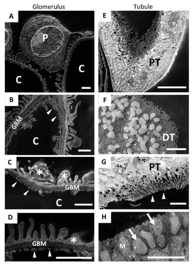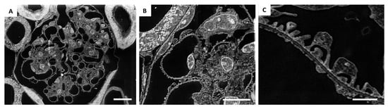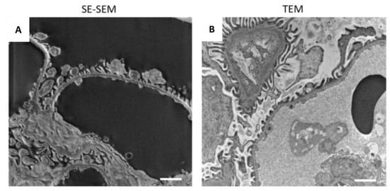 - Masum, M.A.; Ichii, O.; Elewa, Y.H.A.; Nakamura, T.; Otani, Y.; Hosotani, M.; Kon, Y. Modified scanning electron microscopy reveals pathological crosstalk between endothelial cells and podocytes in a murine model of membranoproliferative glomerulonephritis. Sci. Rep. 2018, 8, 10276. [Google Scholar] [CrossRef]