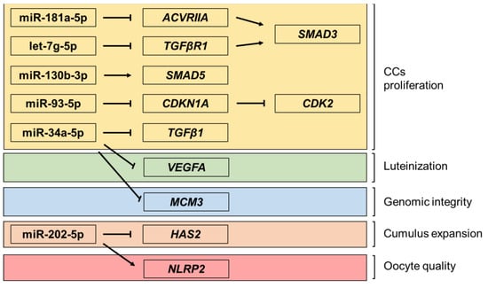 A complex bidirectional communication is observed between the oocyte and the cumulus cells (CCs) that surround it, which not only have trophic functions, but are also involved in the maintenance of the meiotic block of the oocyte during follicular growth [1]. The study of the cumulus-oocyte complex allows one to establish that a ‘competent’ oocyte cannot exist without a ‘competent’ cumulus. For this reason, a molecular analysis of the CCs is nowadays considered predictive of oocyte quality [2]. For example, the stage of CC development is associated with the fate of the follicle: their proliferation promotes follicle maturation and ovulation, while their apoptosis causes atresia and follicle degradation [3]. In this light, for proper follicular recruitment, development, and ovulation, somatic and germinal cells within the ovaries need to precisely express specific genes in a coordinated fashion [4]. MicroRNAs (miRNAs) represent a class of small (18–22 nt) non-coding, single-stranded RNAs actively regulating the mRNA translation of over 70% of protein-coding genes, and they are widely involved in both normal and pathological states [5]. MiRNAs’ role in ovarian cells has been partially elucidated, and their influence on key ovarian functions such as steroidogenesis, ovulation, and the development and function of the corpus luteum has been discovered [6]. Recent evidence showed the regulatory function of miRNAs in oocyte maturation and ovarian follicular development by promoting granulosa cells proliferation [7,8,9,10], or cell apoptosis and the formation of the corpus luteum [11,12,13,14]. Thus, understanding the mechanisms underlying the way in which somatic cell miRNAs are regulated and identifying their specific target genes and functions can lead to the development of strategies to achieve specific gene regulation for the prevention and treatment of various ovarian disorders.