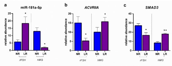 Expression profiles: (a) miR-181a-5p; (b) ACVRIIA: activin A receptor type 2A; (c) SMAD3: smad family member 3. Results are reported as mean ± standard deviation. Statistical significance was set at p < 0.05 and calculated by Student’s t-test. Asterisks above columns indicate statistical differences between NR and LR groups. * = p < 0.05; ** = p < 0.01.