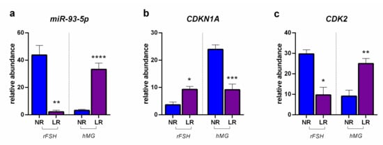 Figure 3 reports the modulation of miR-93-5p determined in CCs by the two examined COS treatments in NR and LR patients, together with the expression of CDKN1A and CDK2. The results showed a significantly lower expression of miR-93-5p in LR patients treated with rFSH, with respect to NR, which was reflected in a higher expression of the CDKN1A target gene, and, subsequently, in a lower expression of CDK2, in turn, a target of CDKN1A. Conversely, as a response to the COS treatment based on hMG, the expression of miR-93-5p was significantly higher in LR patients with respect to NR, leading to a lower expression of CDKN1A and a higher expression of CDK2.