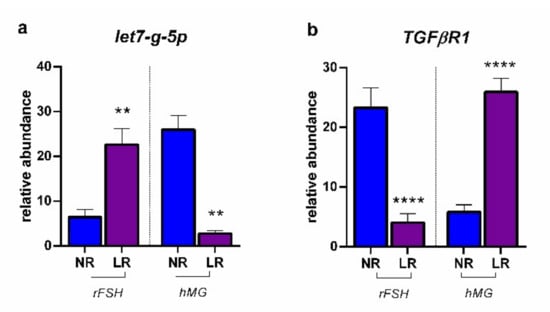 Expression profiles: (a) let-7g-5p; (b) TGFβR1: transforming growth factor beta receptor 1. Results are reported as mean ± standard deviation. Statistical significance was set at p < 0.05 and calculated by Student’s t-test. Asterisks above columns indicate statistical differences between NR and LR groups. ** = p < 0.01; **** = p < 0.0001.