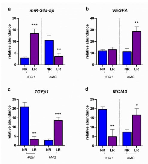 Figure 6 reports the modulation of miR-34a-5p determined by the two different COS treatments in NR and LR patients, together with the expression of VEGFA, TGFB1, and MCM3. Data revealed the contrasting response of NR and LR patients to the COS treatment: in fact, the administration of rFSH resulted in significantly higher values of miR-34a-5p expression, consistently leading to a lower expression of TGFB1 and MCM3 (VEGFA showed no significant difference between NR and LR treated with rFSH). The treatment with hMG determined a lower expression of the miRNA of interest in LR patients with respect to NR ones, together with a higher expression of TGFB1, VEGFA, and MCM3.