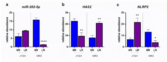 In addition to the miRNAs and target genes mentioned above, miR-202-5p and its target genes HAS2 (hyaluronan synthase 2) and NLRP2 (Nod-like receptor family pyrin domain contains 2) were analyzed. miR-202-5p showed a higher expression level in LR patients treated with rFSH, with respect to NR ones, and in NR patients treated with hMG, with respect to LR ones. The subsequent expression profiles of HAS2 and NLRP2, respectively, positively and negatively correlated with oocyte quality, confirm the positive effect of the rFSH treatment on NR patients, and of hMG on LR patients.