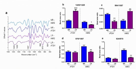 (a) Average spectra of NR and LR groups, treated with rFSH and hMG, reported in second derivative mode (1300–900 cm−1); the wavenumbers of the most relevant peaks are labelled at the bottom. Results of Student’s t-test on band area ratios (b) 1240/1220, (c) 994/1087, (d) 970/1087, and (e) 924/970. Histograms show the values of the band area ratios obtained by curve fitting procedure on mean spectra and the mean ± standard deviation spectra of NR and LR groups, treated with rFSH and hMG. Data are reported as mean ± standard deviation. Statistical significance was set at p < 0.05 and calculated by Student’s t-test. Asterisks above columns indicate a statistically significant difference between NR and LR groups. * = p < 0.01; ** = p < 0.01; *** = p < 0.001.