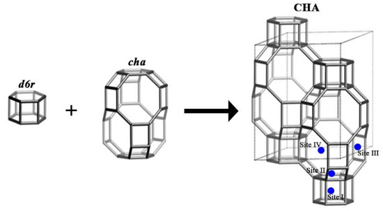 Chabazite consists of two main secondary building units, namely a hexagonal prism, formed by two parallel rings of six tetrahedra, called d6r, and a cha block, which contains rings of six and eight tetrahedra linked together (Figure 1). These two subunits form tertiary structures, which in turn combine to build the crystalline zeolitic structure of chabazite. cha blocks are joined to d6r blocks via six-member rings, these rings allow the connection to other cha blocks in the [001] direction, connecting to other cha blocks through an eight-member ring [17,18]. Chabazite is a zeolite with good cation exchange capacity. There are four different cationic sites in the chabazite structure: site I (hexagonal prism) in the center of a double six-ring prism, site II (supercage) on the axis of the six-ring prism triad, but shifted into the supercavity, site III in the supercavity and near the four-ring window, and site IV near the eight-ring opening [19].