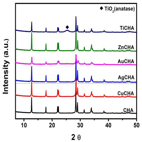 According to the X-ray diffraction results shown in Figure 2, the predominant crystalline phase found in the samples was a zeolite of the chabazite type. Clear signals on diffraction patterns at 2θ = 12.70°, 21.84° and 31.35° correspond to the main peaks of the chabazite-type structure, which have already been reported, indicating the presence of this structure [19,41]. From the experimental data presented, it can be seen that the incorporation of Ti, Zn, Cu, Ag, and Au does not lead to a loss of crystallinity, in contrast to other known observations in analogous cases during ion exchange for transition metals [42]. The chabazite synthesized in this work, with interplanar distances (in Å) corresponding to the planes (hkl) of 6.95 (−110), 4.97 (111), 4.04 (210), 3.99 (−211), 3.13 (300), 3.07 (−310), 2.85 (−131), 2.64 (−321), 2.34 (400), 2.31 (−410), 2.02 (−233) and 1.92 (−431) retains its crystallinity in the course of ion exchange. On the XRD diffraction patterns of all ion-exchanged powders, chabazite was found as the main phase. Additionally, a diffraction peak for TiO2 in the anatase phase, with a plane (1 1 1) at 25.3° was identified in the TiCHA sample [31]. It should also be noted that the intensities of the peaks of the TiCHA and AuCHA samples significantly decreased in comparison with the synthesized initial chabazite and other ion-exchange samples. The average grain size for all chabazite samples was obtained applying the Debye–Scherrer equation, which states that the grain size is inversely proportional to the average width of the maximum diffraction peak and the cosine of the maximum peak angle [43]. The average grain size for the chabazite samples was ~195 nm, except for the AuCHA sample for which it was ~81 nm.