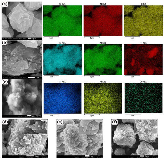 SEM images and EDS elemental mappings of (a) CHA (Si is shown in green, Al is shown in red and K is shown in yellow); (b) TiCHA (Si is shown in turquoise blue, Al is shown in green and Ti is shown in red); (c) CuCHA (Si is shown in blue, Al is shown in green and Cu is shown in yellow). (d–f) SEM images of ZnCHA, AgCHA and AuCHA, respectively.