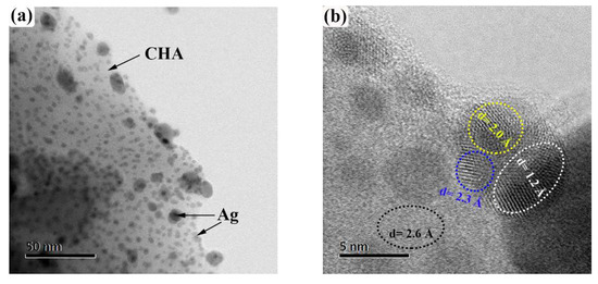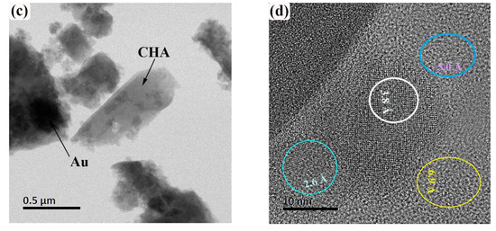 Figure 4 shows the morphology and structural parameters of AgCHA and AuCHA obtained using TEM. Ag and Au metal nanoparticles (dark spots) are observed on chabazite microcrystals. Figure 4a shows a micrograph of Ag nanoparticles supported on CHA. These particles are regularly distributed on the CHA surface as observed. The thermal calcination in an air atmosphere forced the exchanged silver ions to migrate to the surface, where they were reduced to neutral atoms and remained in the form of aggregated metallic nanoparticles [45]. The observed sizes of nanoparticle are in the range from 5 nm to 80 nm. At higher magnification in Figure 4a, it can be seen that the silver nanoparticles are crystalline. In Figure 4b, four crystalline planes can be clearly identified. The interplanar distances (ovals) for AgCHA are 2.3 Å, 2.0 Å, and 1.2 Å, which can be associated with planes (111), (200) and (311), respectively [46]. The found geometric and plane characteristics can be related to the fcc crystal structure of silver. EDS confirmed its presence, as shown in Table 1. The 2.6 Å interplanar spacing may be related to the (−321) CHA plane. Figure 4c shows a micrograph of Au nanoparticles supported on CHA, the sizes of Au nanoparticles are observed from 30 nm, consistent with the SEM image (Figure 3f). In Figure 4d, the interplanar distances for AuCHA are shown; they are 6.9 Å, 5.0 Å, 3.8 Å and 2.6 Å, associated with the planes of crystalline gold (−110), (111), (−211) and (−321), respectively.