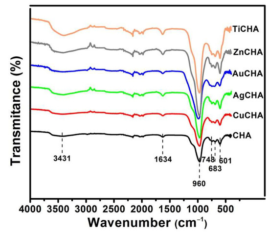 The FTIR spectra of the original and modified chabazites were investigated in the range of 4000–400 cm−1 and are shown in Figure 5. The bands found show signals similar to those previously reported. The band at 3354 and 1634 cm−1 are attributed to stretching and bending vibrations of the O-H group, respectively [47]. The band at 960 cm−1 is associated with the asymmetric stretching vibration of Si-O-Si and Si-O-Al or with the stretching vibration of SiO4 in the chabazite structure. The bands at 683 and 748 cm−1 are attributed to the symmetric stretching vibration of Si-O-Si. The band at 601 cm−1 is related to the coupling vibration of the (SiO4)4+ and (AlO4)5+ tetrahedra [48,49,50]. The bands in the range of 800 to 500 cm−1, in addition to being related to the Si-O and Al-O tetrahedral units, are related to the sorption of metal cations [25]. In TiCHA, there was a slight shift of the peak at 960 cm−1 from the CHA at 969 cm−1, attributable to the Si-O-Ti bond. A certain amount of Ti could be incorporated into the cha structure during exchange treatment [51].