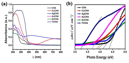 The diffuse reflectance absorption spectra of synthesized and modified chabazites are shown in Figure 6a. A UV–vis spectroscopy analysis was used to determine the current status of Ti, Zn, Cu, Ag and Au species. For the CuCHA sample the band at approximately 234 nm is attributed to the O → Cu2+ charge transfer [58]. The band at ~280–330 nm is attributed to the conversion of exchanged copper ions into oligonuclear [Cu-O-Cu]n species, and the band at 330–420 nm to crystalline CuOx. The band at ~780 nm is attributed to the Cu2+ d-d (3 d9) transition [59,60,61]. In AgCHA, an absorption peak at ~430 nm is observed, indicating the presence of Ag nanoparticles [62]; the presence of silver cations (Ag+) is attributed to the observed peak at ~222 nm [63]. ZnCHA represents an absorption band at 330–390 nm, evidence of the presence of ZnO [64]. TiCHA had the highest absorption in the UV region compared to other modified chabazites. In the case of TiCHA, two absorption bands can be observed below and above 300 nm, called charge transfer bands. The absorption bands of Ti4+ ion (3d°) are observed at ~250 nm and 290 nm [65]. The charge transfer for TiO4 units is in the range of 200–260 nm; for the TiO2 lattice in the anatase phase, the charge transfer in TiO6 is greater than 300 nm [66]. The band gap Eg of synthesized chabazite and modified chabazites was calculated with the following known Equation (1):