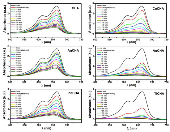 The photocatalytic degradation activities of CHA, CuCHA, AgCHA, AuCHA, ZnCHA and TiCHA were evaluated in the presence of UV light and H2O2. The UV–vis absorption spectra of MB during degradation by catalytic samples at different irradiation times are shown in Figure 7. These optical absorption spectra correspond to aliquots of MB solutions taken at different times from 0 to 150 min. At 0 min, this corresponds to the absorption spectrum of the MB solution at the beginning of the experiment. The MB dye exhibits an absorption maximum at ~664 nm in the visible region [67]. It is observed that with an increase in the time of irradiation with UV light, the peak of maximum absorption at ~664 nm gradually decreases, and a more pronounced change is observed for CuCHA, AuCHA and TiCHA. The change in the color of the MB solution in the AuCHA and TiCHA samples during 30 min of darkness can be explained by the adsorption of MB molecules on the exposed open surface of the chabazite microcrystals [31]. Furthermore, in all photodegradation experiments, it can be observed that absorption bands change slightly at lower wavelengths over time. This blue shift in the wavelength of MB absorption bands can be attributed to the N-demethylation of MB molecules during photodegradation under the influence of UV light irradiation [68].