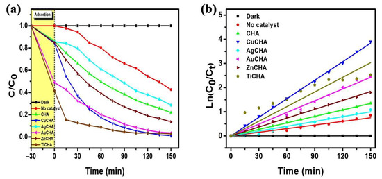 Figure 8a shows the change in the relative MB concentrations as a function of the time of exposure to UV light. The degradation rate of the MB dye is much lower in the AgCHA sample, which may be due to the low dispersion of Ag nanoparticles on the chabazite surface [75]; or, because MB is a cationic dye, it degrades little, due to the presence of Ag (Ag+) ions on the surface causing electrostatic repulsion between MB and AgCHA microcrystals, inhibiting the photodegradation process [76]. On the other hand, the photoreduction of Ag+ could be taking place, causing the elimination of eCB−, and in turn hVB+ would oxidize the silver nanoparticles, becoming a dominant process in the presence of oxygen, inhibiting the photodegradation of MB, as shown in Equations (10) and (11) [77].