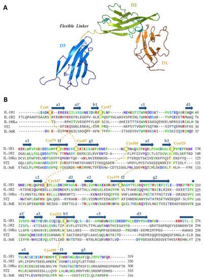 - Ge, J.; Remesh, S.G.; Hammel, M.; Pan, S.; Mahan, A.D.; Wang, S.; Wang, X. Functional relevance of Interleukin-1 receptor inter-domain flexibility for cytokine binding and signaling. Structure 2019, 27, 1296–1307.e5. [Google Scholar] [CrossRef] [PubMed]