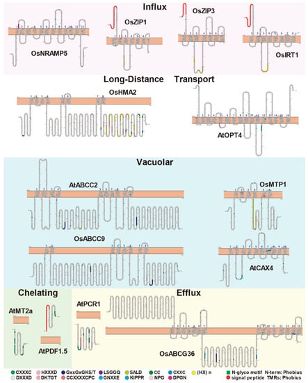 | OsABCC9 | Significantly induced by Cd treatment in roots | Tonoplast | 8 TMDs, cysteine-rich loop, Q-loop, Walker B residue, and HXXXD and DXXXD residues at the N-terminus. | [88] | |