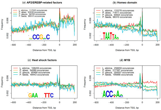 Positional distribution of transcription factor binding sites (TFBS) in Larix sibirica, Picea abies, Picea glauca, and Pinus taeda based on PWM scanning using TRANSFAC. (a) AP2/EREBP-related factors; (b) Homeodomain; (c) Heat shock transcription factors; (d) Myb transcription factors.