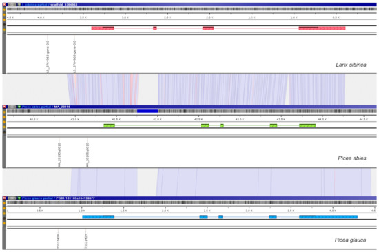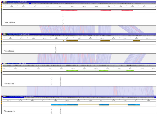 Pinus taeda genome assembly and annotation Pita v2_01 [45,78,79] were taken from https://treegenesdb.org/FTP/Genomes/Pita/v2.01 (accessed on 21 January 2020). Genome assembly PG29 v3.0 and the corresponding annotation for Picea glauca [44,80] were taken from ftp://plantgenie.org/Data/ConGenIE/Picea_glauca/PG29/v3.0/ (accessed on 16 January 2020); to our knowledge, assembly v4.0 has not yet been fully annotated. However, we also considered the manual annotation for assembly v4.0 added to annotation v3.0 Picea abies [43]; genome data Pabies_v1.0 were retrieved from ftp://plantgenie.org/Data/ConGenIE/Picea_abies/v1.0 (accessed on 16 January 2020). Corresponding annotations for the High Confidence set (predicted gene models with more than 70% homology with reference proteins) and the Medium Confidence set (predicted gene models with between 30% and 70% homology with reference proteins) as provided by the authors were grouped. For Larix sibirica [46], genome assembly under NCBI GenBank accession NWUY0000000000 (BioProject PRJNA393226) and unpublished draft annotation data were used. The detailed parameters of the genome assemblies used in the study are presented in Table 1.