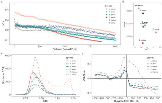 Some GC statistics for four conifer species, Larix sibirica, Picea abies, Picea glauca, Pinus taeda, and two model plant species, Arabidopsis thaliana and Oryza sativa: (a) GC3 gradient of coding sequences, (b) GC3 gradient slope, (c) GC3 distribution across all CDSs, (d) CG-skew around TSSs.