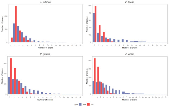 Distribution of the exon number per gene in GC3-poor and GC3-rich genes in L. sibirica, P. abies, P. glauca, and P. taeda. The number of genes in the GC3-poor and GC3-rich categories was the same within each organism.
