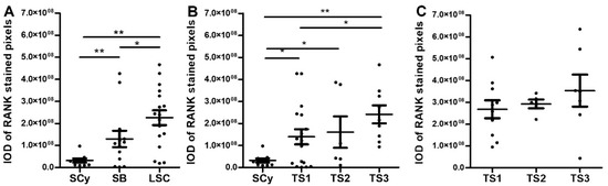 RANK protein expression in serous ovarian tumor tissues represented as IOD mean ± standard error of mean (SEM). (A) RANK expression values in LGSOC samples grouped attending to category. Abbreviations: IOD = integrated optical density, SCy = serous cystadenoma (n = 9), SB = serous borderline (n = 14), LSC = low-grade serous carcinoma (n = 32). (B) RANK expression values in LGSOC samples grouped by tumor stage. Abbreviations: TS1 = tumor stage 1, TS2 = tumor stage 2, TS3 = tumor stage 3. (C) RANK expression values in HGSOC samples grouped by tumor stage. Abbreviations: HSC = high-grade serous carcinoma (n = 22), TS1=tumor stage 1, TS2 = tumor stage 2, TS3 = tumor stage 3. * p ≤ 0.05, ** p ≤ 0.01 statistically significant differences between different groups after one-way ANOVA followed by Fisher LSD post-hoc test analysis.