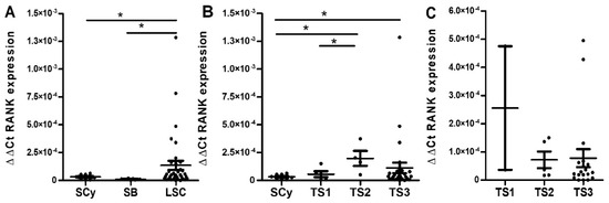 RANK mRNA expression in serous EOC represented as 2−∆∆Ct RANK mean ± SEM. (A) RANK mRNA expression values in LGSOC samples grouped by tumor category. Abbreviations: SCy = serous cystadenoma, (n = 9), SB = serous borderline (n = 7), LSC = low-grade serous carcinoma (n = 30). (B) RANK mRNA expression values in LGSOC samples grouped by tumor stage. Abbreviations: TS1 = tumor stage 1, TS2 = tumor stage 2, TS3 = tumor stage 3. (C) RANK mRNA expression values in LGSOC samples grouped by tumor stage. Abbreviations: HSC = high-grade serous carcinoma (N = 26), TS1 = tumor stage 1, TS2 = tumor stage 2, TS3 = tumor stage 3. * p ≤ 0.05 statistically significant between-group differences after Kruskal–Wallis followed by Mann–Whitney post-hoc test.
