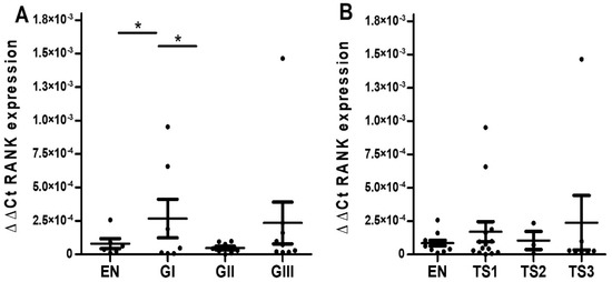 RANK mRNA expression in endometrioid ovarian tumor tissues represented as 2−∆∆Ct RANK mean ± SEM. (A) RANK mRNA expression values in samples grouped by histological grade. Abbreviations: EN = endometrioma (n = 11), GI = Grade I endometrioid carcinoma (n = 7), GII = Grade II endometrioid carcinoma (n = 11), GIII = Grade III endometrioid carcinoma (n = 11). (B) RANK mRNA expression values in samples grouped by tumor stage. Abbreviations: TS1 = tumor stage 1, TS2 = tumor stage 2, TS3 = tumor stage 3. * p ≤ 0.05 statistically significant differences between different groups after Kruskal–Wallis followed by Mann–Whitney post-hoc test analysis.