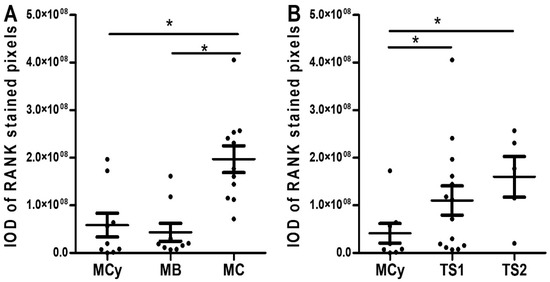 RANK protein expression in mucinous ovarian tumor tissues, represented as IOD mean ± SEM.) (A) RANK expression values in samples grouped by histological grade. Abbreviations: IOD = integrated optical density, MCy = mucinous cystadenoma (n = 9), MB = mucinous borderline tumor (n = 9), MC= mucinous carcinoma (n = 10). (B) RANK expression values in samples grouped by tumor stage. Abbreviations: TS1 = tumor stage 1, TS2 = tumor stage 2. * p ≤ 0.05 statistically significant between-group differences after one-way ANOVA followed by Fisher LSD post-hoc test analysis.