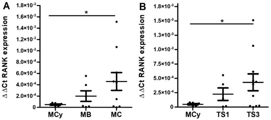 RANK mRNA expression in mucinous ovarian tumor tissues represented as 2−∆∆Ct RANK mean ± SEM. (A) RANK mRNA expression values in samples grouped by histological grade. Abbreviations: MCy = mucinous cystadenoma (n = 6), MB = mucinous borderline tumor (n = 6), MC= mucinous carcinoma (n = 10). (B) RANK mRNA expression values in samples grouped by tumor stage. Abbreviations: TS1 = tumor stage 1, TS3 = tumor stage 3. * p ≤ 0.05 = statistically significant differences between different groups after Kruskal–Wallis followed by Mann–Whitney post-hoc test analysis.