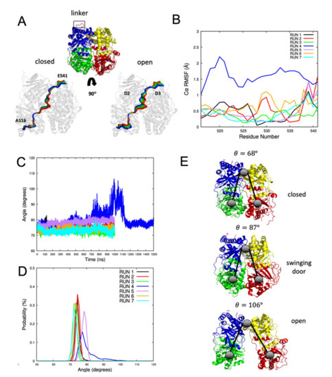 Next, we measured the opening angle of IDE to describe, in further detail, the hinge-type motion (Figure 3C–E). Taking the COM of D1 and D4, combined with the COM of the linker, yields an opening angle of a maximum of 106 degrees (run 4) compared to ~68 degrees when it is closed (runs 1, 2, 3, 6, and 7). As expected, the angle values of the fourth trajectory follow the same pattern as the previous results (Figure 2A,F). The angle values fluctuate extensively until reaching their maximum at ~990 ns. A prompt decrease is observed at 1.1 μs, coinciding with the closing of the IDE cavity. Interestingly, the swinging door state (run 5) displayed a distinct angle spanning between 75 and 80 degrees. Therefore, the latter observation confirms the slight opening and twisting motions characterizing the swinging door motion of IDE. This leads to the conclusion that the description of the opening angle, using the hinge-loop as the center point, results in a more accurate distinction between the open and closed states.