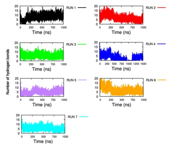 Number of hydrogen bonds formed between D1 and D4 along the MD simulations. Black, red, green, blue, purple, orange, and cyan are respectively for runs 1, 2, 3, 4, 5, 6, and 7.