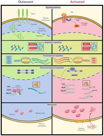 Regulatory mechanisms controlling MuSC quiescence maintenance and quiescence exit (activation). The balance between MuSC quiescence and activation is actively regulated via multiple levels of mechanisms. These mechanisms function at signaling, epigenetic, transcriptional, post-transcriptional and metabolic levels, and together determine the fate of MuSCs. Notch signaling is highly active under quiescence, which is replaced by PI3K signaling upon activation. The epigenetic landscape also differs significantly between quiescent and activated MuSCs. The metabolic reprogramming upon activation is orchestrated with utilization of distinct cellular metabolic pathways. In terms of transcriptional landscape, MuSC activation is accompanied with a drastic reduction of Notch targets and induction of many immediate early genes (IEGs). The post-transcriptional mechanisms, including intron retention and the microRNA pathways, are also essential to maintain MuSC quiescence while preserving their rapid response to injury cues.