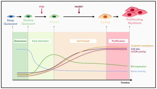 mTORC1 activity is low in quiescent MuSCs, but is rapidly induced upon early activation [62,79]. Moreover, activation of mTORC1 also drives the entry of MuSCs into the Galert stage. The initial activation of mTORC1 is totally dependent on the PI3K activity, as depletion of p110α of PI3K or Rptor severely blocked MuSC activation and muscle regeneration [79,95]. On the contrary, forced activation of mTORC1 through ablation of Pten or using a constitutive active form of p110α triggers spontaneous activation of MuSCs [33,79]. Thus, mTORC1 activity functions as a key molecular switch: it is off in quiescent MuSCs but rapidly turned on upon MuSC activation. Moreover, our group demonstrated that there is a continuous increase in mTORC1 activity throughout the entire quiescence exit process [144] (Figure 2). While p110α of PI3K is required to trigger the initial mTORC1 activation, the subsequent enhancement of mTORC1 activity is dependent on PAXBP1 and induction of many PAXBP1-controlled antioxidant genes [144]. In the absence of PAXBP1, the first wave of mTORC1 activation is unaffected. However, the subsequent increase in mTORC1 activity is totally abolished, resulting in impaired cell growth and metabolic reprogramming. As a result, the mutant MuSCs fail to re-enter the cell cycle and undergo a p53-dependent apoptosis. Blocking the second wave of mTORC1 activation with chemical inhibitors similarly prevents MuSC from cell cycle re-entry [144].