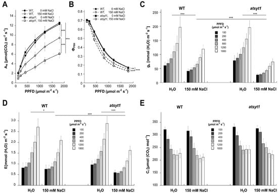 Light response curves for gas exchange and chlorophyll a fluorescence parameters in leaves of wild-type (WT) and atsyt1 plants irrigated with water and 150 mM NaCl. (A) Net photosynthetic rate (AN). (B) The effective photochemical quantum yield of photosystem II (ΦPSII). (C) Leaf stomatal conductance (gs). (D) Transpiration rate. (E) Internal CO2 concentrations (ci). Data are shown as means ± SE (n = 8 for plants irrigated with water and n = 12 for plants treated with 150 mM salt). Effects of photosynthetic photon flux density (PPFD) in combination with effects of genotype or salt treatment were estimated by a two-way ANOVA test. PPFD showed a statistically highly significant effect (p ≤ 0.001) in all cases. Asterisks denote significant effects of genotype or salt treatment (* p < 0.05, ** p < 0.01, *** p < 0.001).